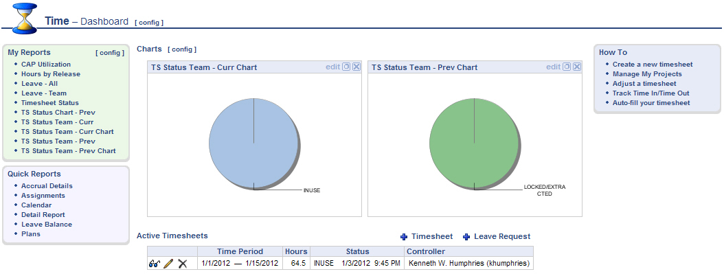 The Time Dashboard provides a number of navigational links, summary information, helpful tips and more. Below is an example dashboard screen with a description of the various items that may be included.
