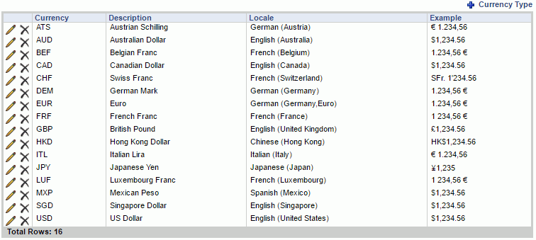 This screen can be used to create and maintain the set of Currency Types that will be available for use in your system when entering expense reports. The system is delivered with a few default values provided and you can add additional or remove sites per your needs. When setting up the currency codes your company uses, it is important that you specify which of these currencies is your company standard (that is, the currency that all expenses will be converted to and stored). The currency code you specify in the System Base Currency (unasense.company.currency) property must match exactly with one of the values in the currency list.