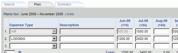 - Cells that have a grayed out amount are not editable. Values appearing in the gray font indicate that the underlying date range for the planned entries do not align with a particular time period (e.g. in the case of monthly -- they would not fall on the 1st and last day of the month, for example, 6/1/2009--> 6/25/09). In these cases, the hours for the underlying planned expense entries are evenly distributed across the monthly cells in an attempt to provide the project manager with an idea of the number of total planned expenses for those periods, however, these entries cannot be modified via the expense Plan with Grid screen (you'll need to use one of the other expense planning maintenance screens).