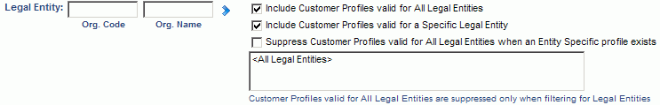 - The intention of this option is to allow you to limit the resulting output by suppressing those output records for customer profile / organizations that have both an "All Legal Entities" entry and a specific Legal Entity entry. Do note that an "All Legal Entities" entry for a specific Customer Profile entry may continue to appear in the resulting output in cases where multiple Legal Entities were included in the list of filtered legal entities and at least one of those legal entities has that Customer Profile association with only the All Legal Entities entry.