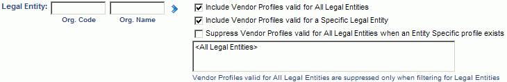 - The intention of this option is to allow you to limit the resulting output by suppressing those output records for vendor profile / organizations that have both an "All Legal Entities" entry and a specific Legal Entity entry. Do note that an "All Legal Entities" entry for a specific Vendor Profile entry may continue to appear in the resulting output in cases where multiple Legal Entities were included in the list of filtered legal entities and at least one of those legal entities has that Vendor Profile association with only the All Legal Entities entry.