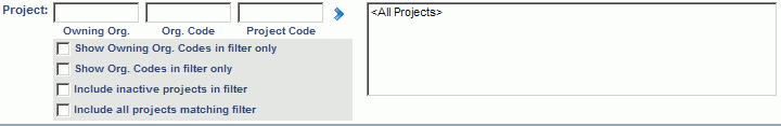 This control can be used to search for projects by Project Code, or those that are associated with a particular Owning Org or Project Org.