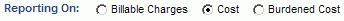 The Reporting On selection criteria can be used to specify whether this report is to reflect Billable amounts, Cost information or Burdened Cost information when performing calculations. On certain reports, the actual bill or cost rate is displayed in the report output. On other reports, the rate may not be displayed, however, this selection option will still influence whether the calculated amount reflects cost data, burdened cost data or bill (revenue) data. In some instances, this control will also influence which budget amounts are considered in the report calculations.