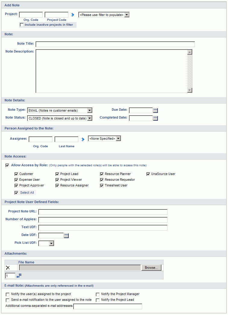 Project Note >> User Defined Fields (administrators can establish additional custom project notes user defined fields)