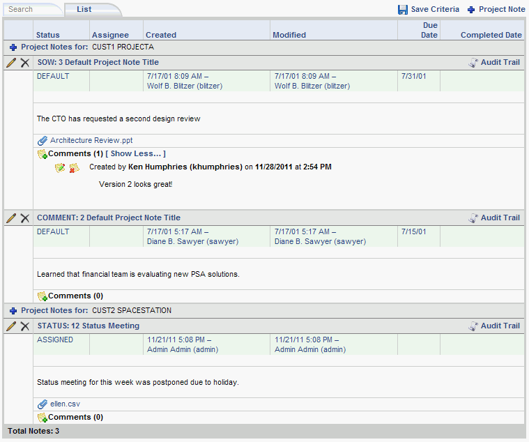 The filtered (or complete) list of Unanet project notes will resemble the following example: