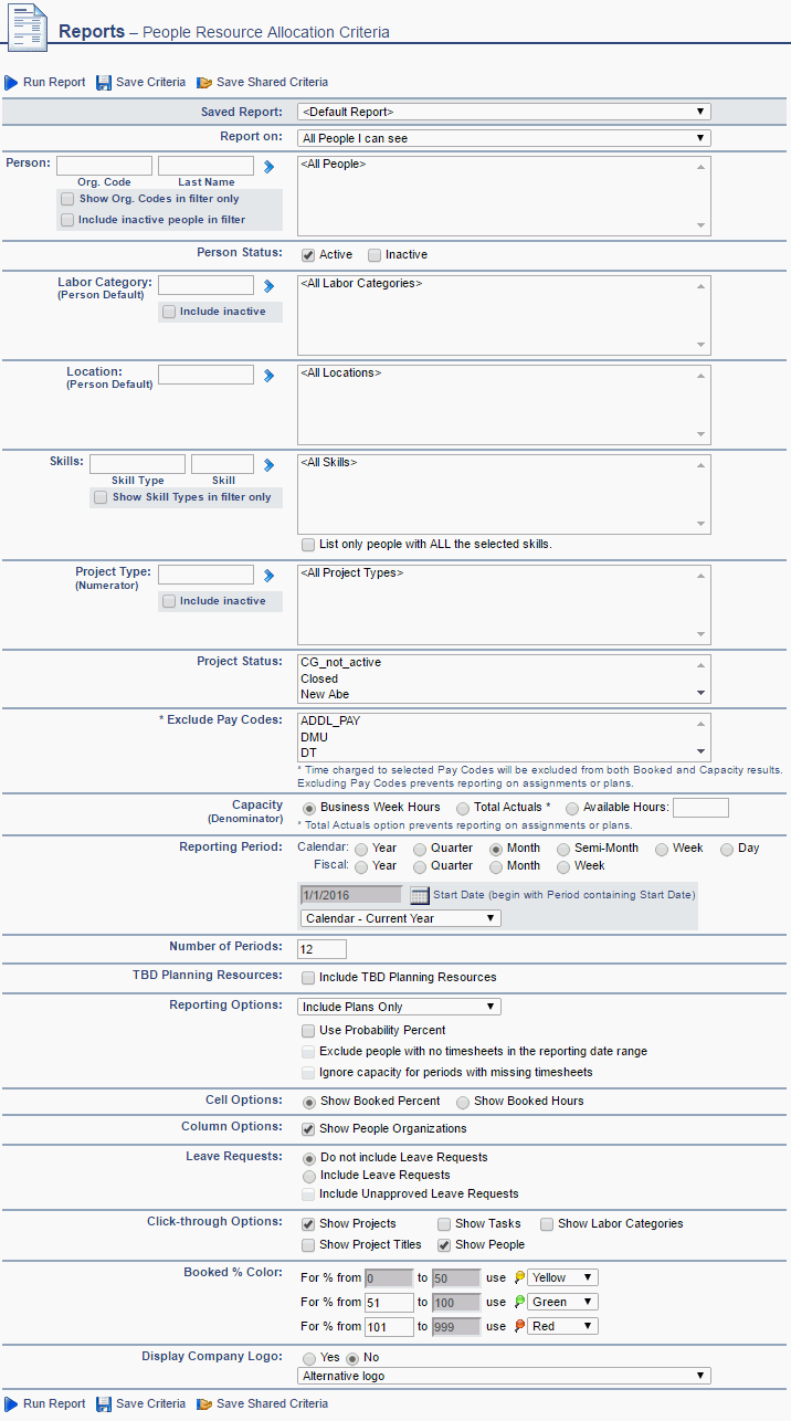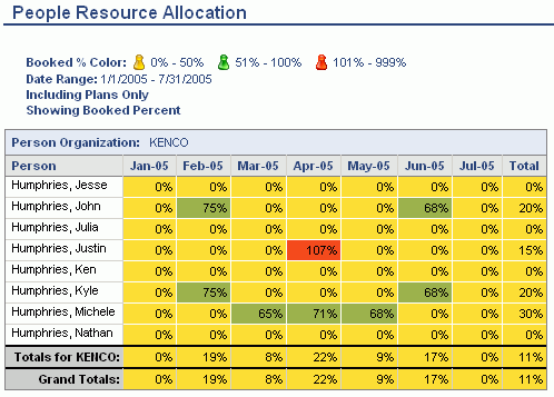 This report can be configured to answer a variety of questions regarding how booked a person is, in terms of actual hours, assigned hours or planned hours (and can optionally consider requested leave as being booked). The output is in a period by period layout (daily, weekly, monthly or quarterly) and can be color coded to help flag those individuals that fall in a particular booked percentage range.