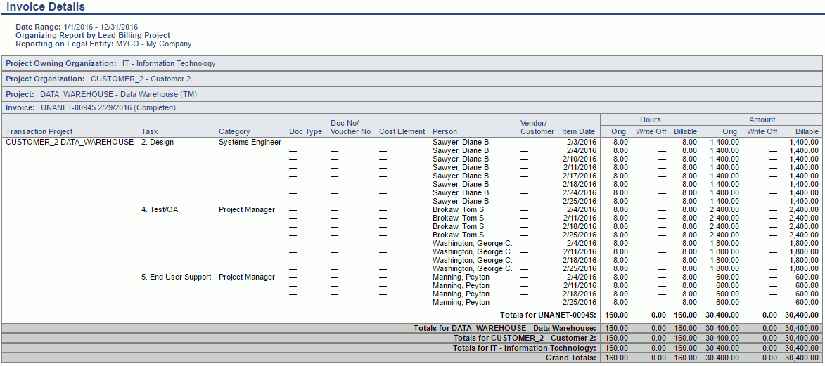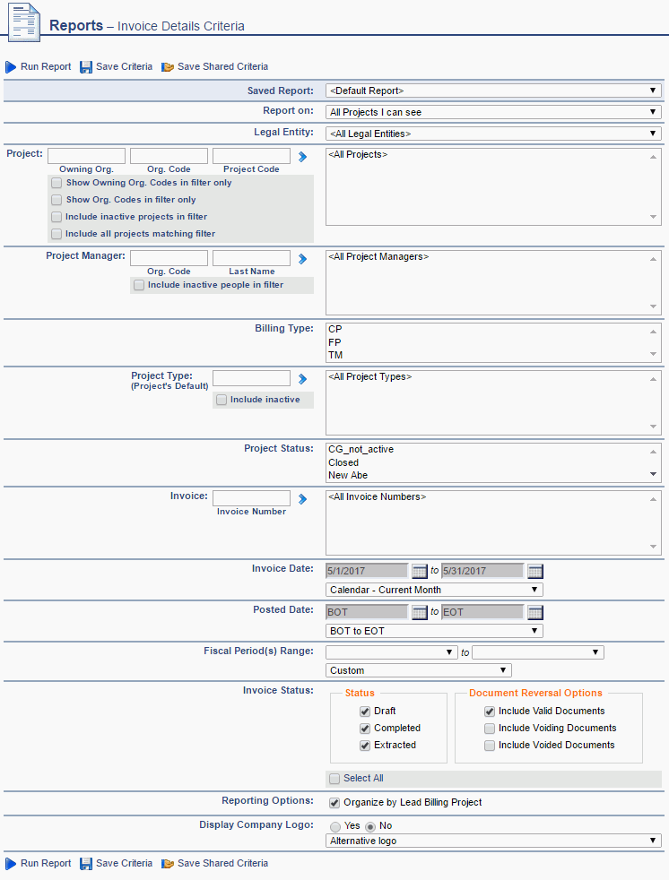 This report provides a view of the data that is included on an invoice, not necessarily at the same level as the data displayed on the invoice. The output can include invoices having a status of draft, completed and those having been marked extracted (via the Admin >> Export >> Accounts Receivable export). This report may be helpful when reviewing multiple invoices for an individual project or a set of projects. This report will show the details of each invoice along with the multiple group totals (e.g. project, project organization, etc.).