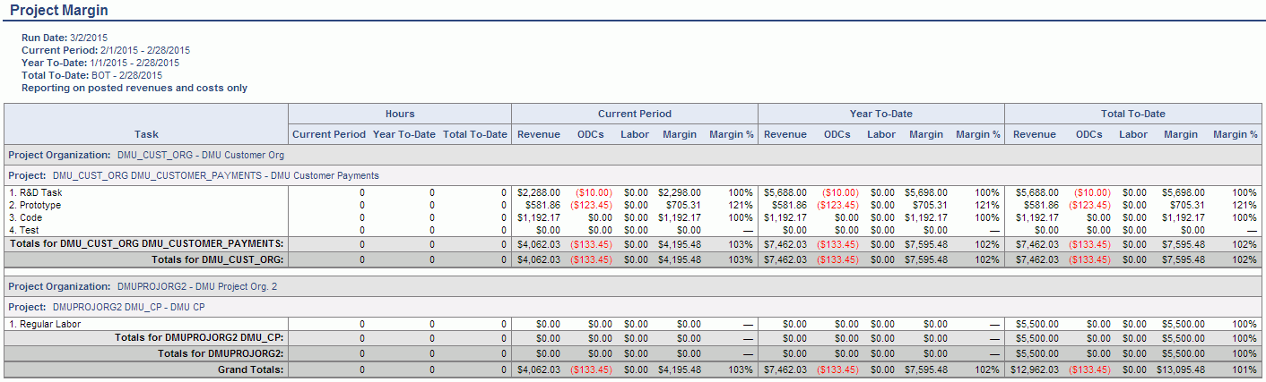 - The T&E version is always grouped by Project Org. The Project Margin can be grouped by various combinations of Project Manager, Project Org, Project Owning Org and Posted Org.