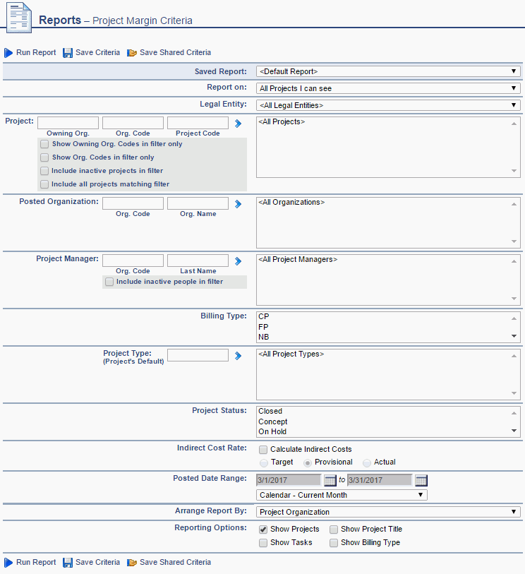 This report will provide details for the Current Period, Year to Date and Total to Date summary of project profitability with one line per Org, Project or Task (depending on selection criteria chosen). The report will only run on posted data and can optionally include Indirect Costs. Options for arranging the output by Project Manager, Owning or Project Org, Posted Org, and more can be configured. This report has the potential to report on net margin as it not only gathers labor and expense bill and cost information, but also considers fixed price, fee and funding cap adjustments, write offs, direct and indirect costs, etc.