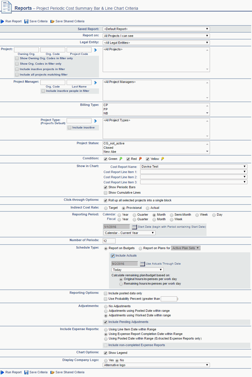 This report is available to users having any of the following roles: Administrator, P&R Administrator, and Project Administrators (that also have the Cost Rate Manager role or the Allow Project Cost Reporting for Non-Cost Rate Managers (unanet.non_cost_mgr.allow_project_cost_reporting) property is enabled).