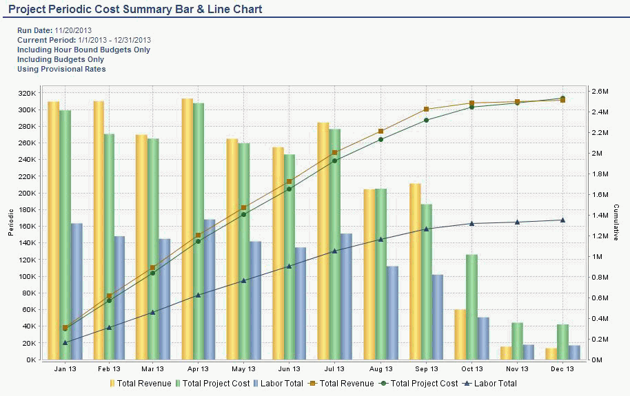 This chart can be run to provide a periodic view of time planned or charged to a project by Cost Report Line Item in a Daily, Weekly, Monthly or Quarterly bar and line chart format. At least one Cost Report line item must be specified in order for the chart to generate and you may include up to three. You can optionally show bars representing periodic amounts per cost report line item and/or a cumulative line for that cost report line item.
