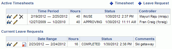 To edit an existing leave request, the user can navigate to either their Home or Time dashboards where they will see a list of Current Leave Requests (which should be directly below their list of Active Timesheets).