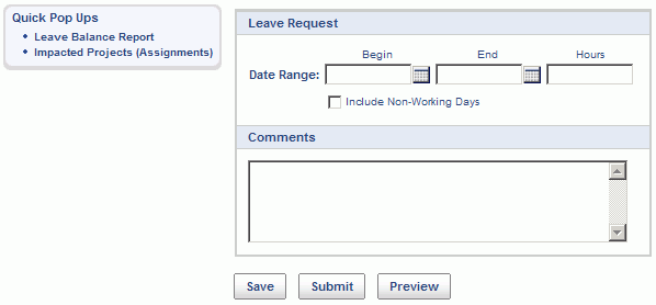 Clicking on the Save or Preview buttons will save the Leave Request, but will not present the request to the Manager for approval.