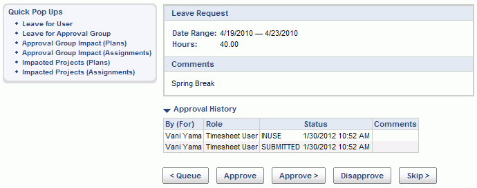 To help provide additional information that can be considered during the Leave Request approval process, several Quick Pop Up reports are available for the user's reference, including: