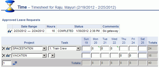 Using this feature, timesheet users can submit a leave request which will flow through their normal timesheet manager approval process. As is the case with the manager approvals, email notifications will be sent to help expedite the approval flow. Approved leave will be presented on users editable and preview versions of their timesheets (in an informational format only). A number of reports are available to display leave request details and status, and many of the reports that display utilization or booked time can be configured to consider the leave time as booked.