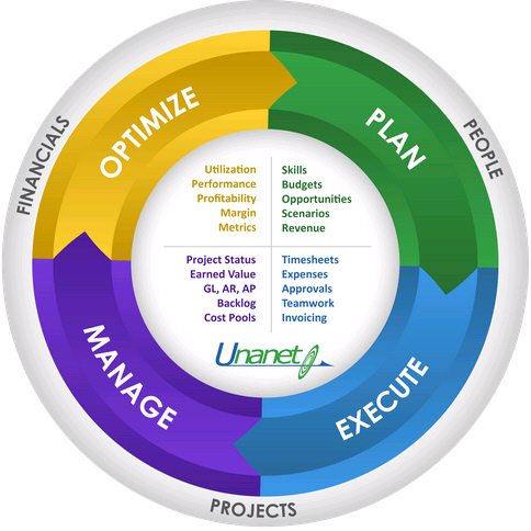 Unanet provides project-driven organizations with resource management, budgeting & forecasting, project management, timesheets, expense reports, project accounting, billing, workforce collaboration, and financials with cost pool calculations, in one integrated system.